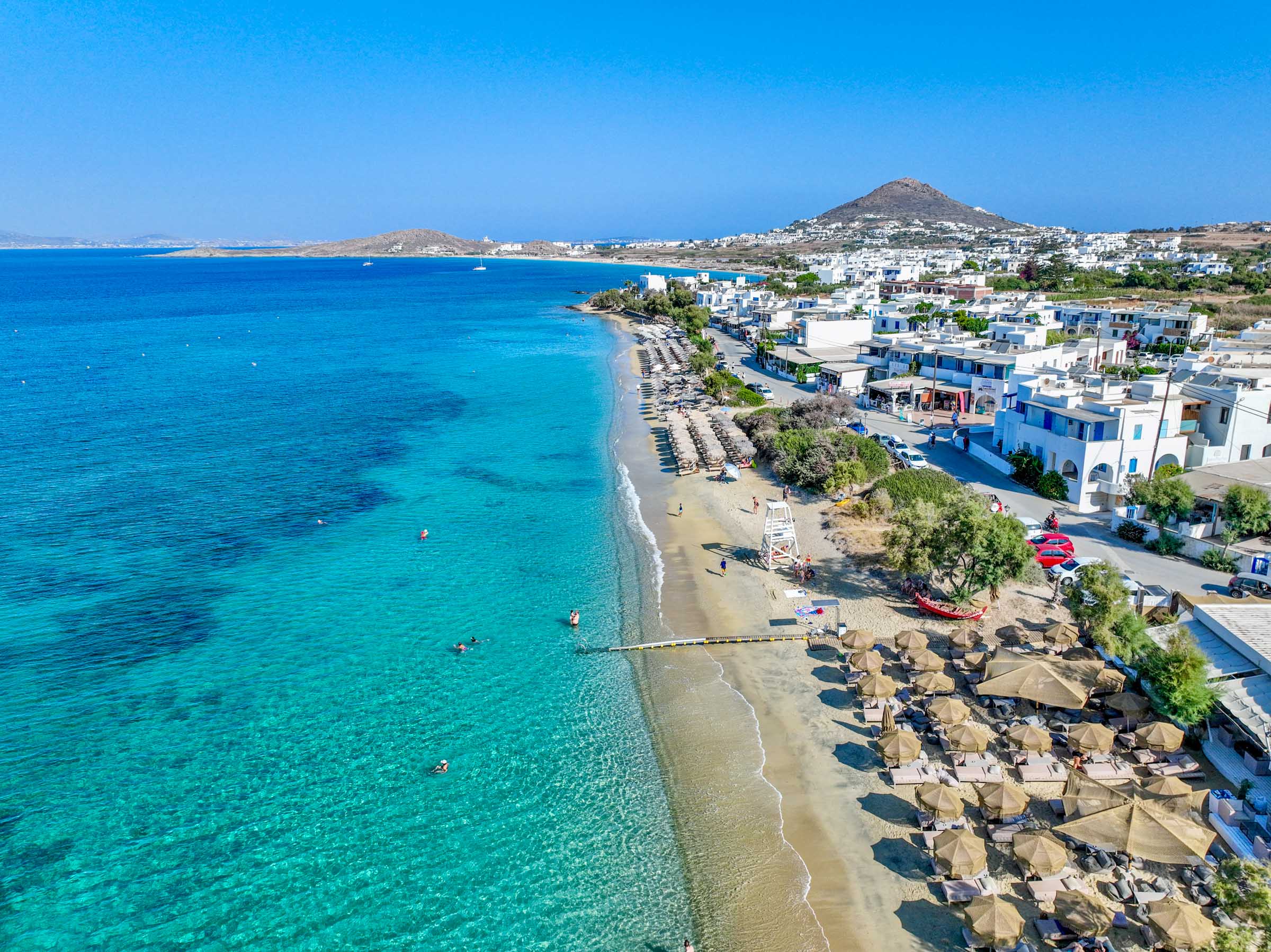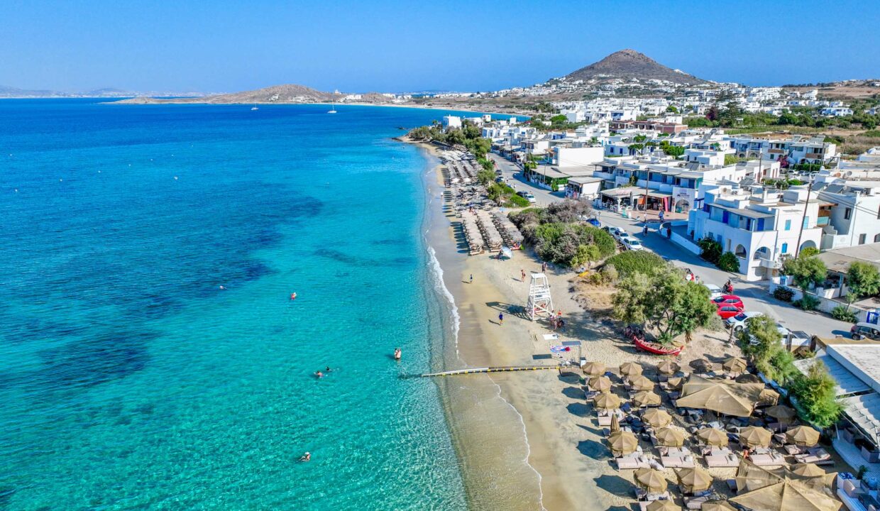 On the west coast of Naxos, a few kilometers from Chora, you can relax on this beautiful sandy beach that alternates small beach bars and restaurants with free beaches.