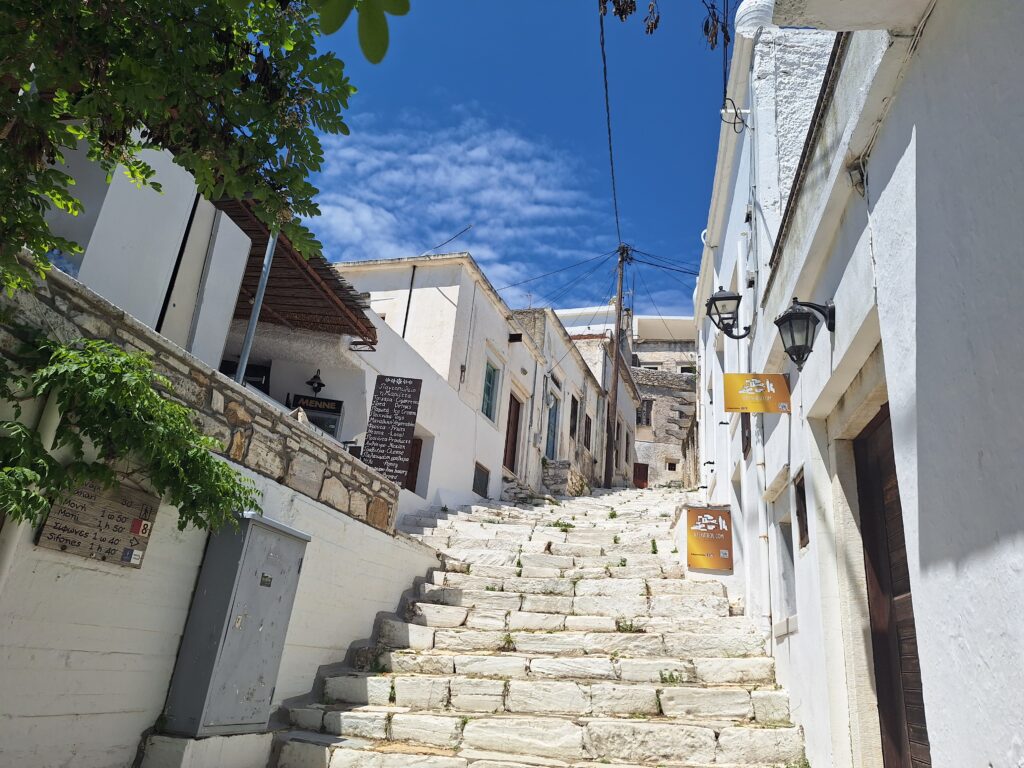 Chora e’ la capitale dell’isola, sulla costa ovest. Famosa per il suo centro storico che abbraccia le mura del Kastro.
