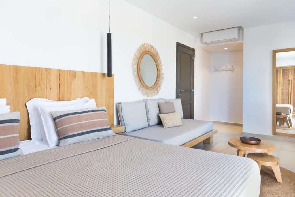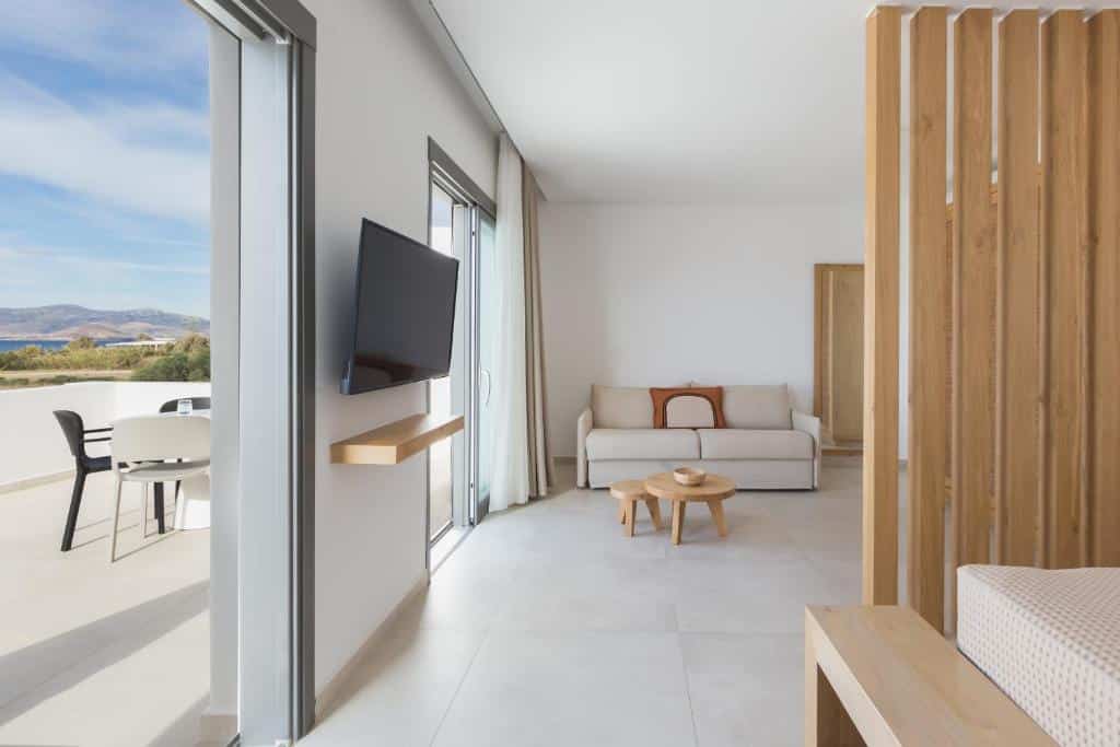 This 39 m² Suite has one double bed and one double sofa bed. There is also a beautiful bathroom with a shower and has a nice balcony with a partial sea view.