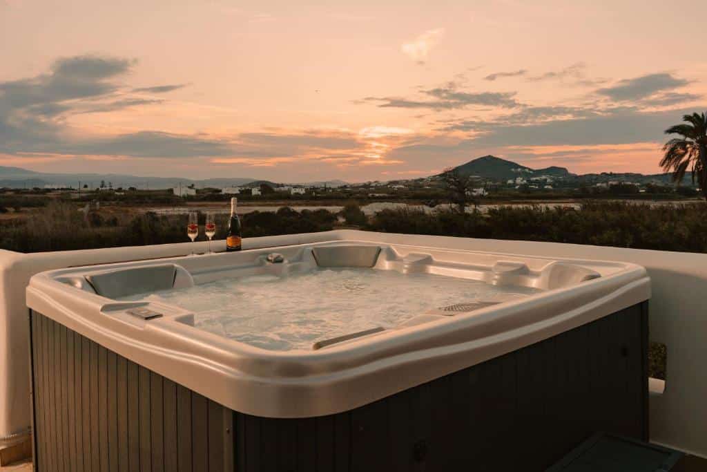 “Everything was exceptional. The Villa was fabulous. I recommend this property highly. A true delight. All the facilities you need on hand. The Host was perfect , very accommodating. The accommodation was clean, spacious, modern and very comfortable. We enjoyed our stay and we all wished we stayed longer! The property is big and comfortable, it is approx. 10 minutes by car away from the beach and also from Chora. You can see nice sunset on the balcony while you are in the jacuzzi! Such a peaceful spot for our group of 6 adults. Would stay here again.”